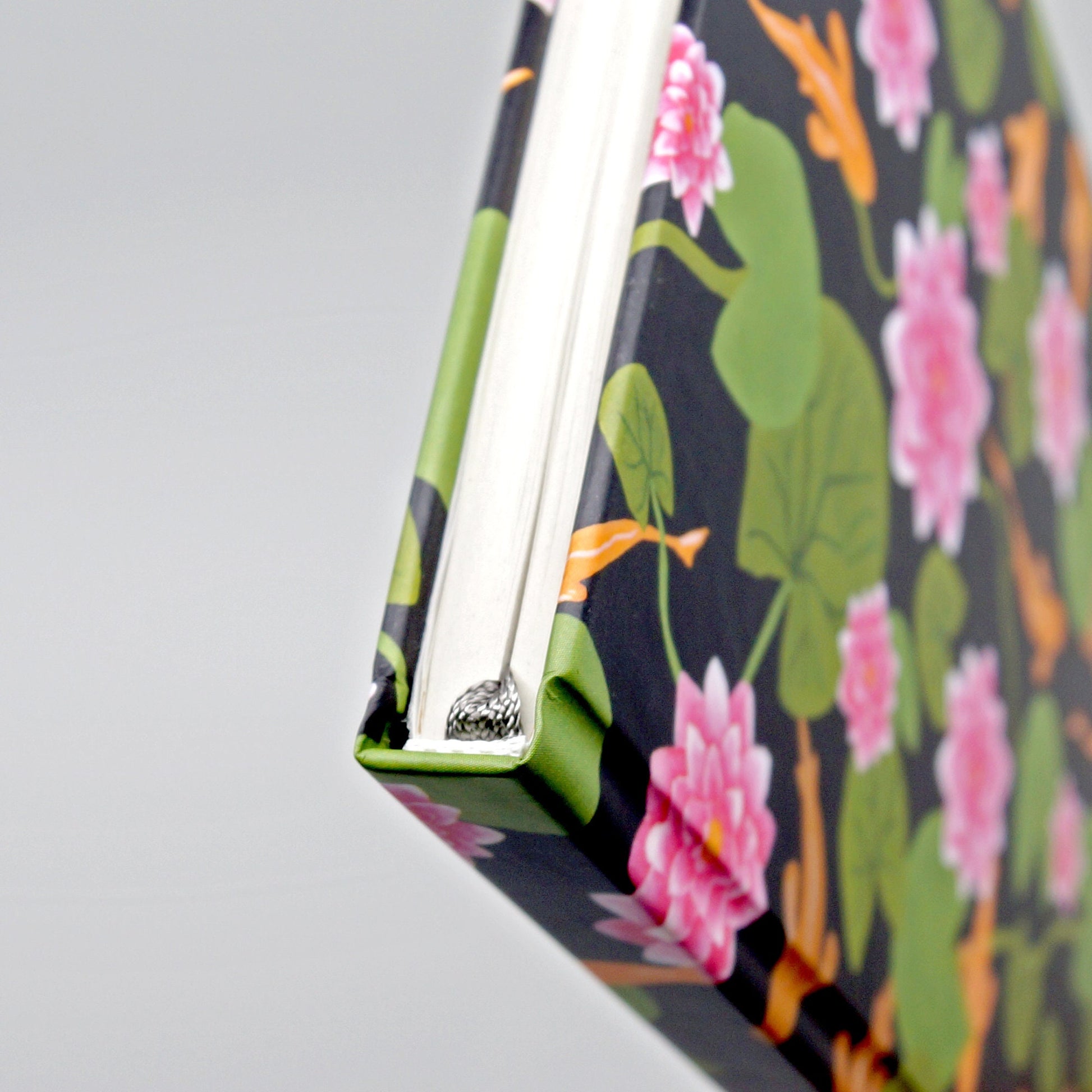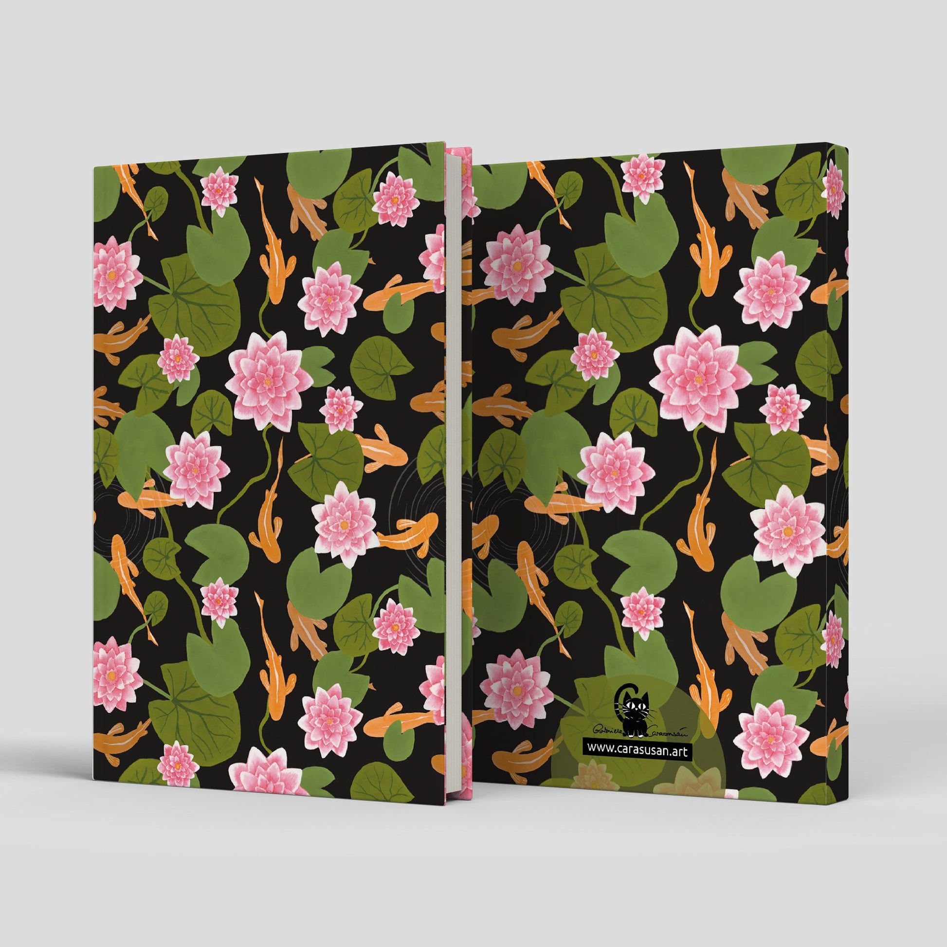 Black dot grid noteboock, Din A5, hardcover, 128 pages, with ribbon bookmark, printed with my hand-painted motif "Waterlily Pond". The book is bound in solid bookbinding cardboard, the inside pages have a dotted bullet pattern and are printed on natural-colored recycled paper.