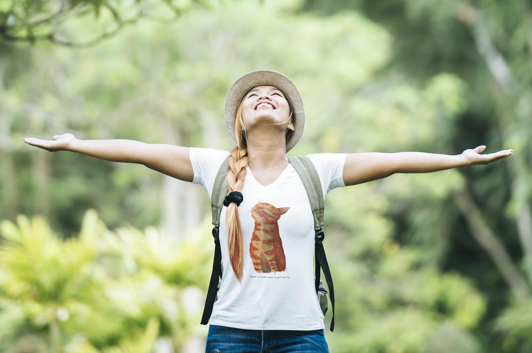 Happy Cat T-shirt with a cute orange cat and quote 'There's happiness in letting go!