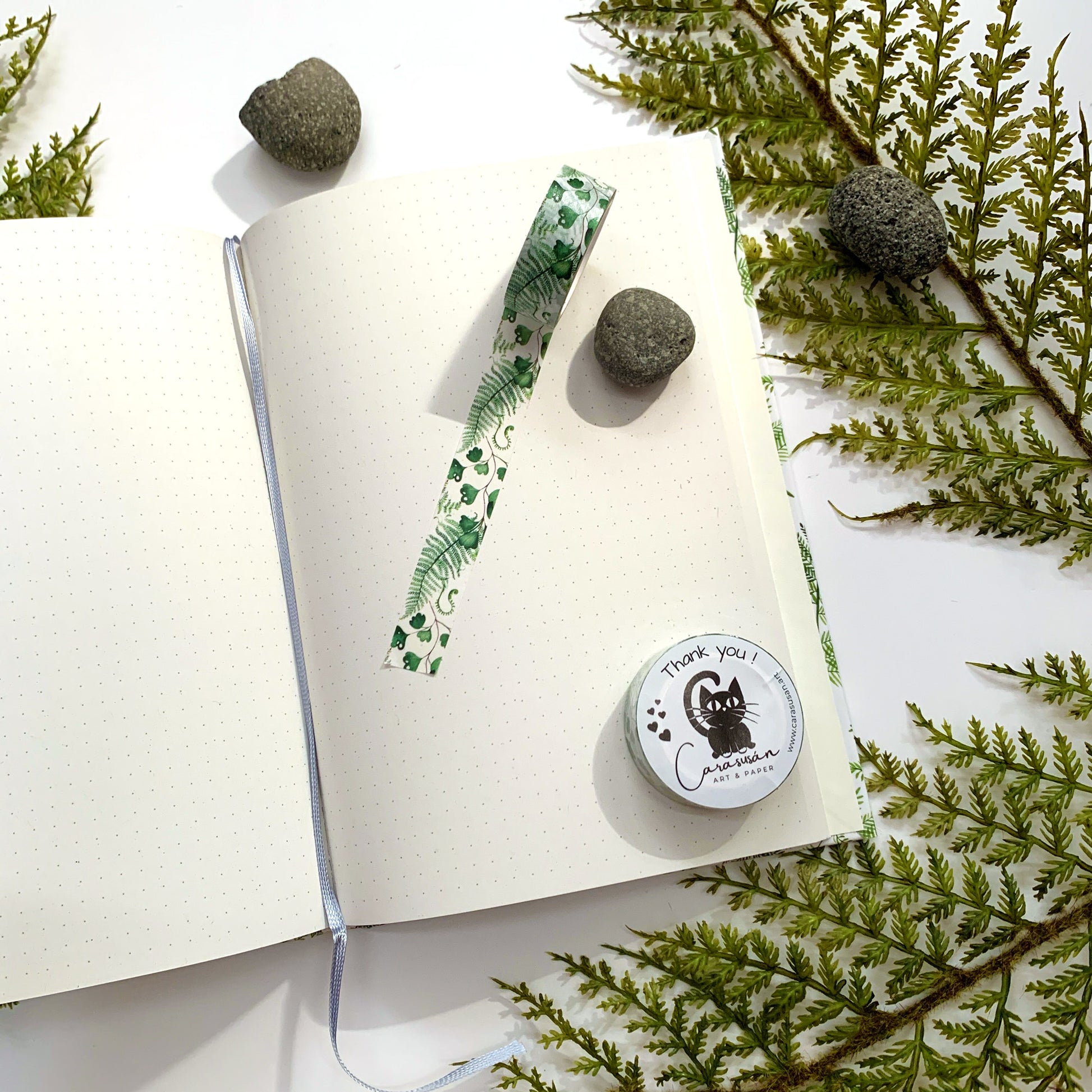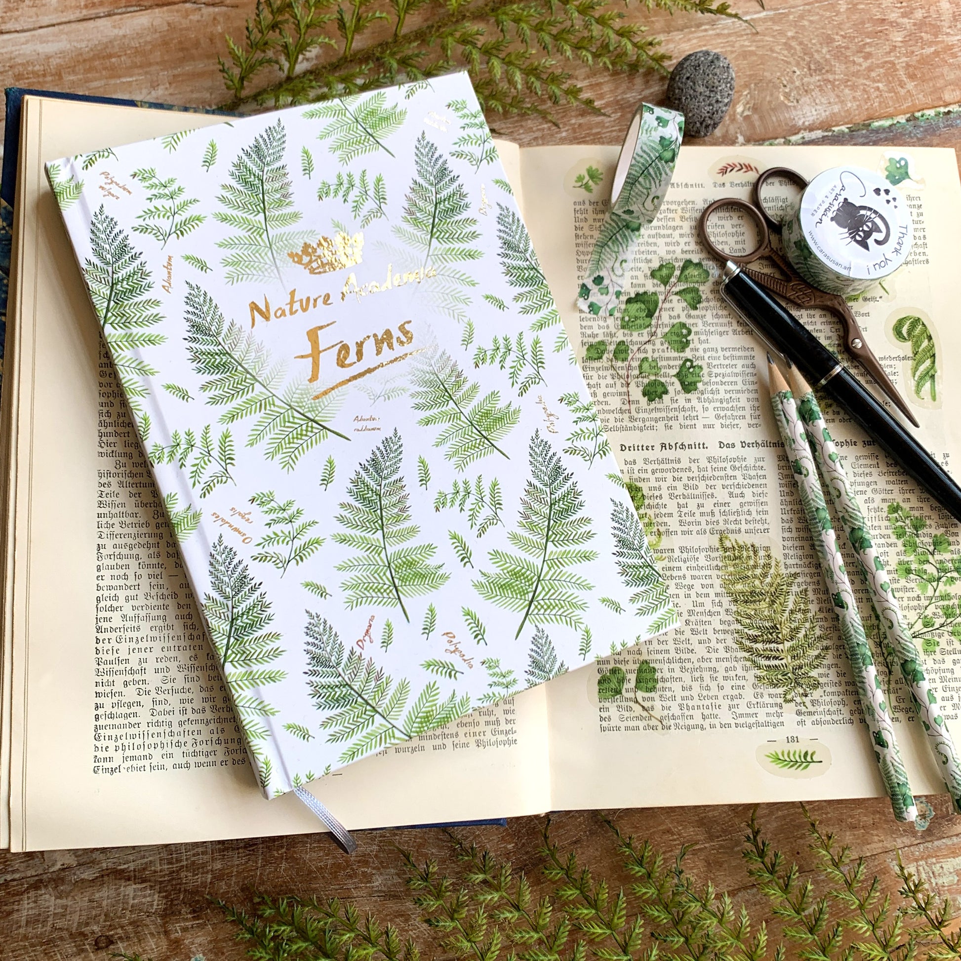 Dot grid notebook or bullet pattern journal Din A5, hardcover, 128 pages, with high-gloss gold foil print and ribbon marker. White with intricate botanical illustrations of various fern leaves. The title and many small letterings with the botanical names of various ferns are printed in fine gold foil. There is a small golden crown on the spine of the book - the trademark for my 'Nature Academia' series. The botanical lettering on the back of the book is also printed in golf foil.