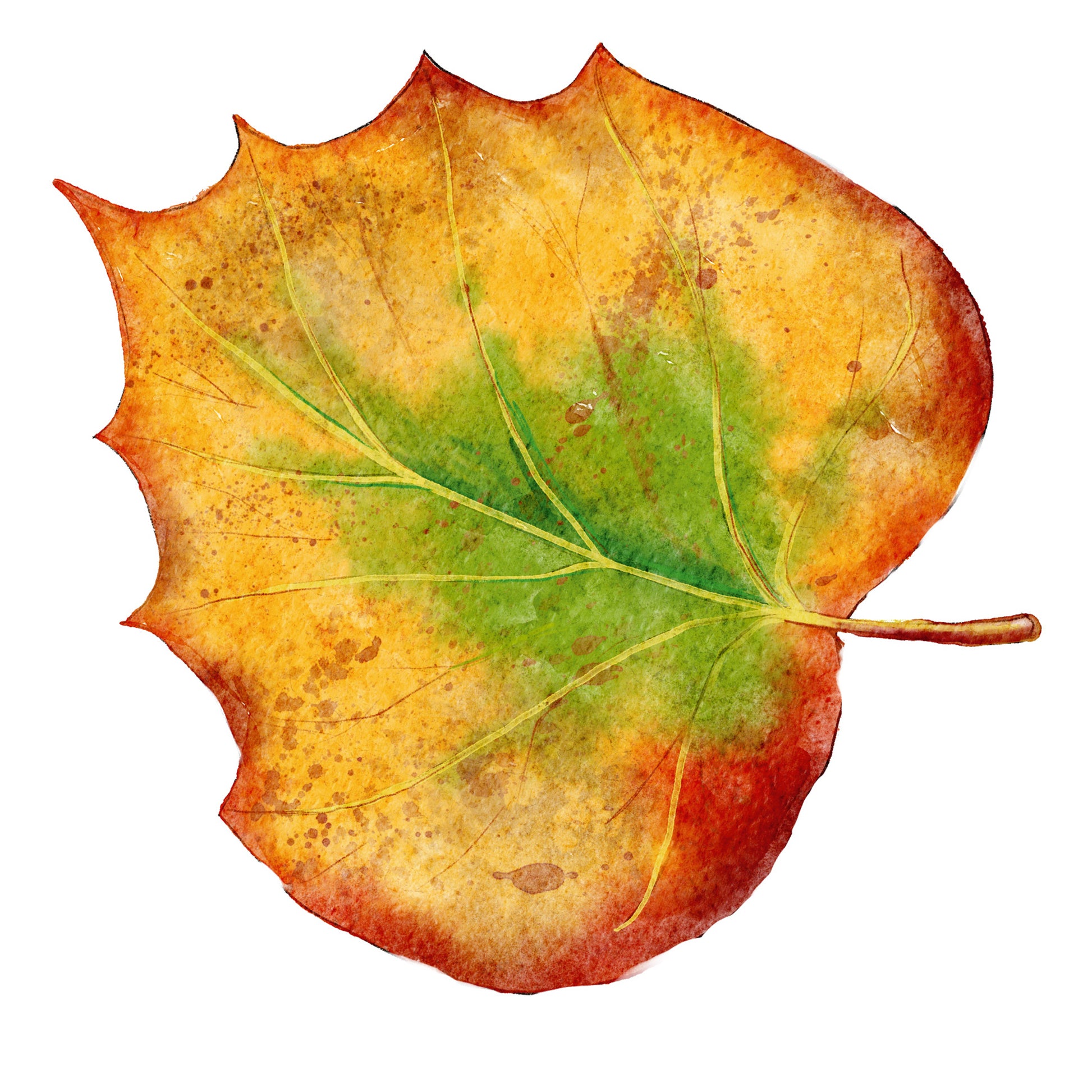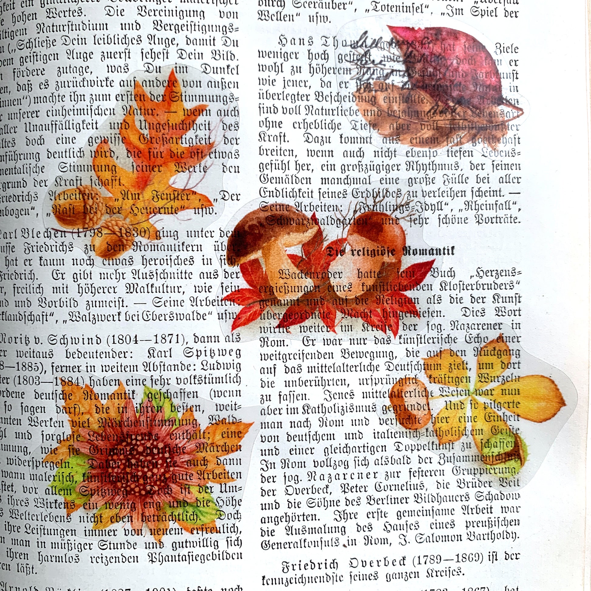 Sticker sheet Din A5, 'Autumn Leaves', botanical watercolor illustrations of autumn leaves, blossoms and berries with writings from old postcards on transparent foil. 14 individual stickers each on the sheet.