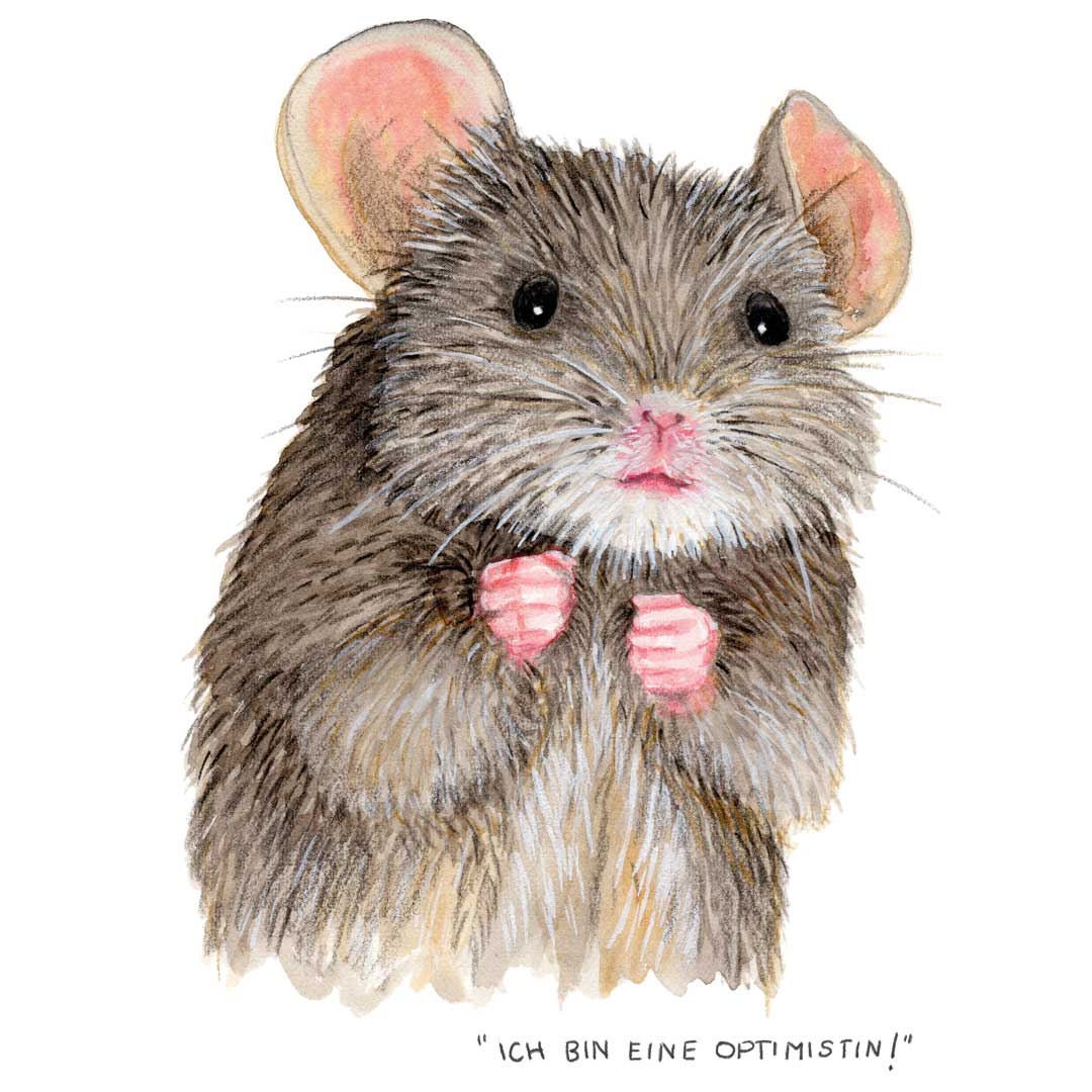 T-shirt with a print of a cute mouse lady and the inscription 'Ich bin eine Optimistin!' (German for 'I am an optimist!') The motif is a print of my cute watercolor painting 'Optimist'.