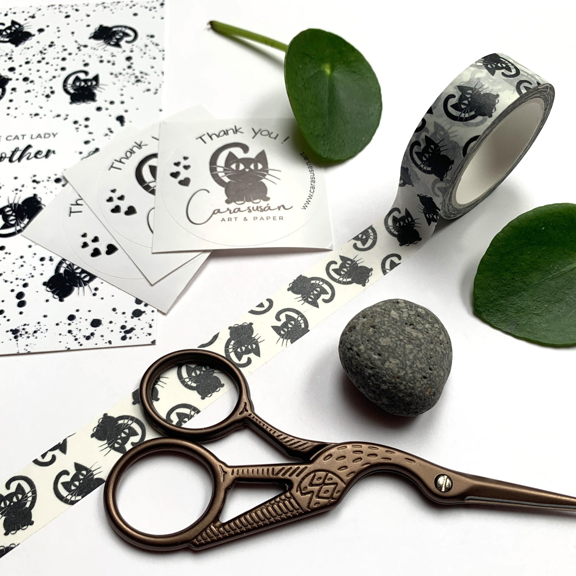 Minimalist Washi tape set with cute kittens, one roll with black cats on white background, the other with festive shiny golden cats in gold foil print. The little kittens are hand-drawn and created after the model of my naughty cat Suse.