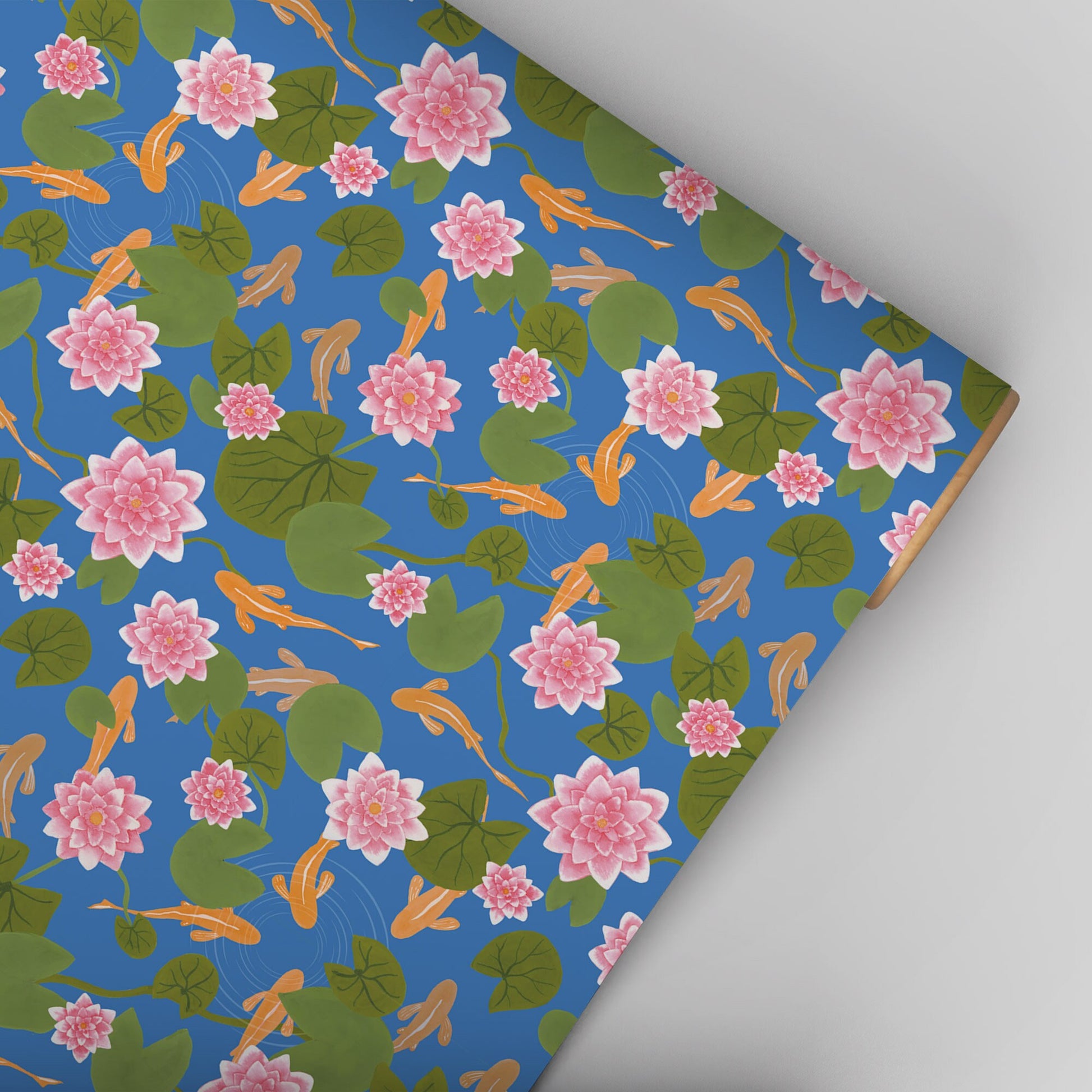 50x70cm, silky shiny wrapping paper with water lilies and goldfish motif printed on recycled paper (approx. 100g/m2).