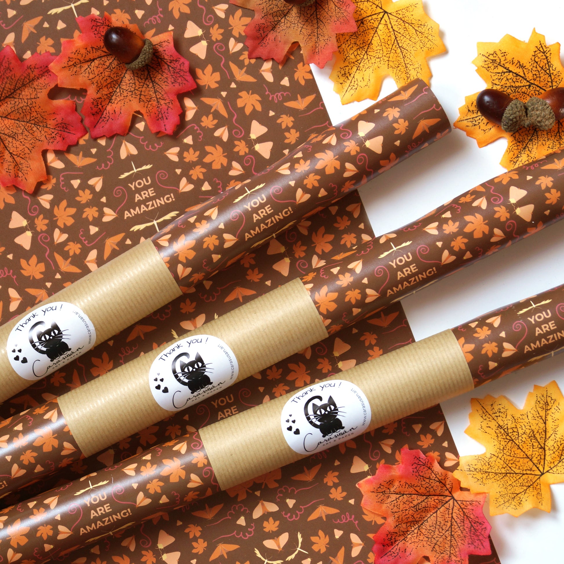 Seidig glänzendes Geschenkpapier mit Herbstlaub und Nachtfalter-Muster aus Recyclingpapier (ca. 100g/m2). Die warmen Farbtöne von Orange, Braun und Pink lassen ein wunderbar herbstliches Gefühl aufkommen.