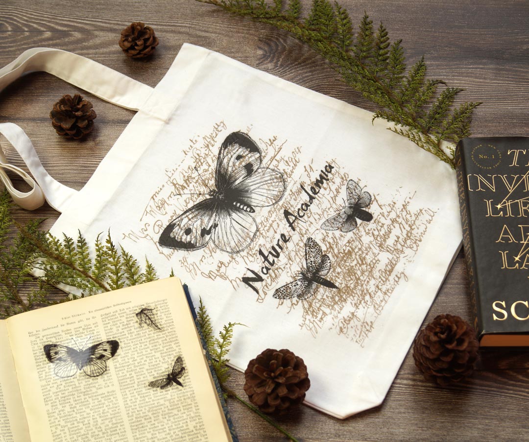 Tote Bag - Jutebeutel im Dark Academia Stil mit Schmetterlingen, vintage Handschriften und der Aufschrift Nature Academia. Die Illustration ist im Stil alter, naturwissenschaftlicher Illustrationen in dezenten Naturfarben gehalten und passt fantastisch zu Deinem Outfit im Dark Academia oder Cottage Core Stil.