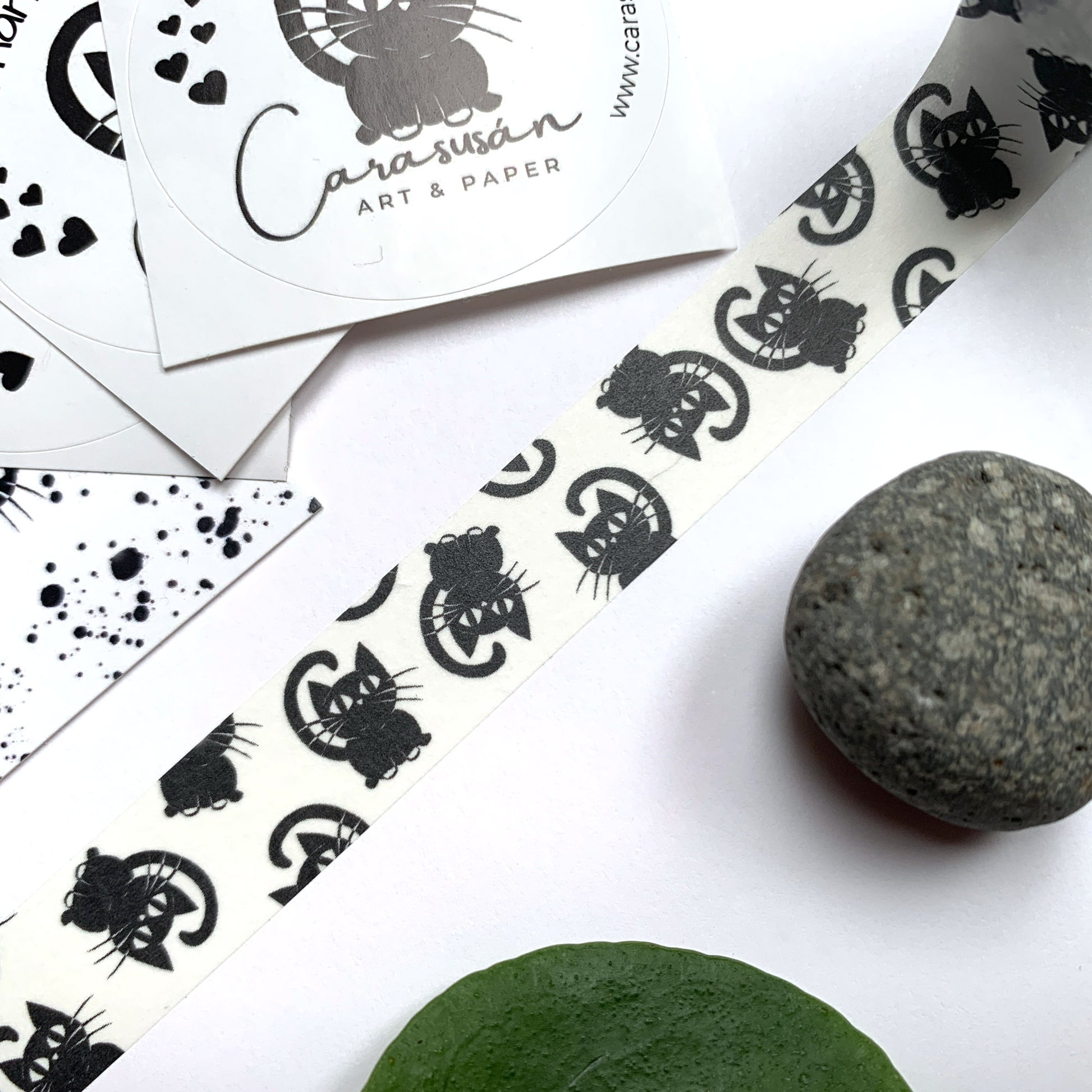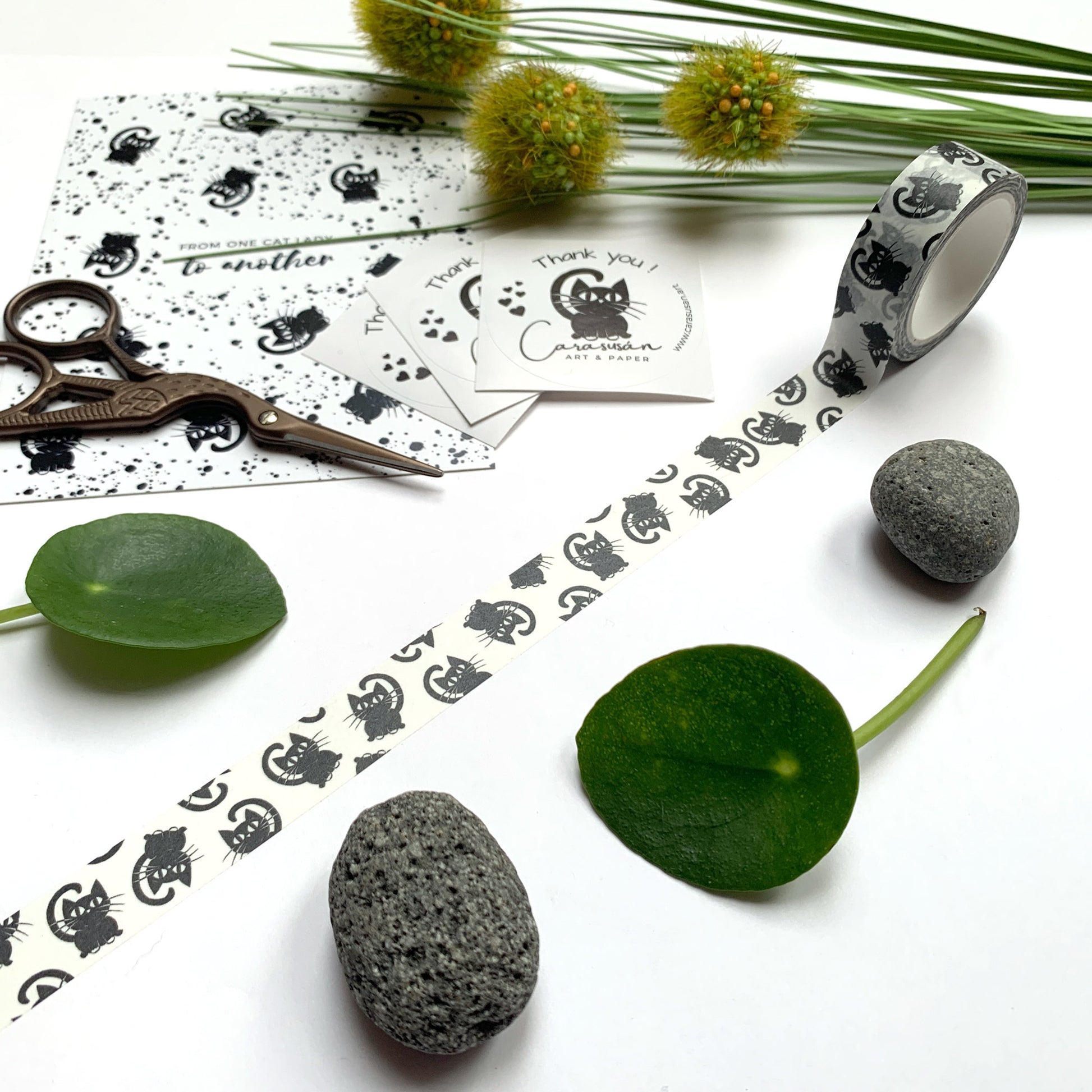 Washi Tape mit niedlichen Katzen Illustrationen in schwarz-weiß. Ein schönes Geschenk für die Katzenfreundin, um Briefe zu verschönern oder Dein Bulletjournal zu gestalten. Auch prima zum Scrapbooking oder Basteln - und ein großer Bringer für den Katzengeburtstag!